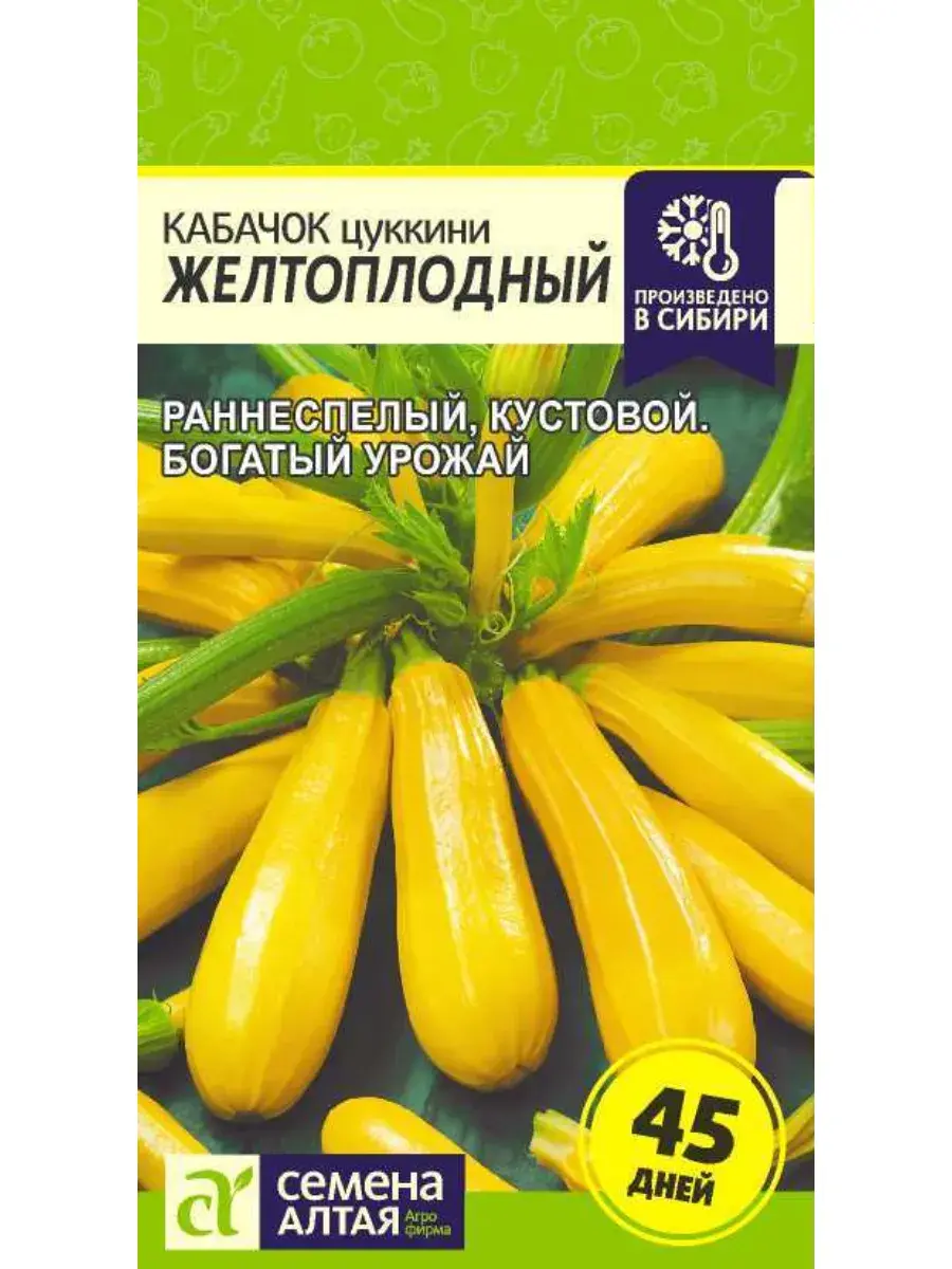 Раннеспелый (43-62 дня от посева до уборки), суперурожайный сорт цуккини. Растение кустовое, с красивыми, интенсивно окрашенными ярко-желтыми плодами массой 0,7-1,8 кг. Плоды длиной до 10 см используют для цельноплодного консервирования. По вкусовым качествам они не уступают огурцам. Сорт пригоден для длительного хранения.
